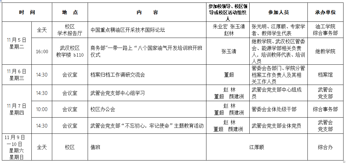 2019-2020学年第一学期第11周校区主要工作及活动安排表