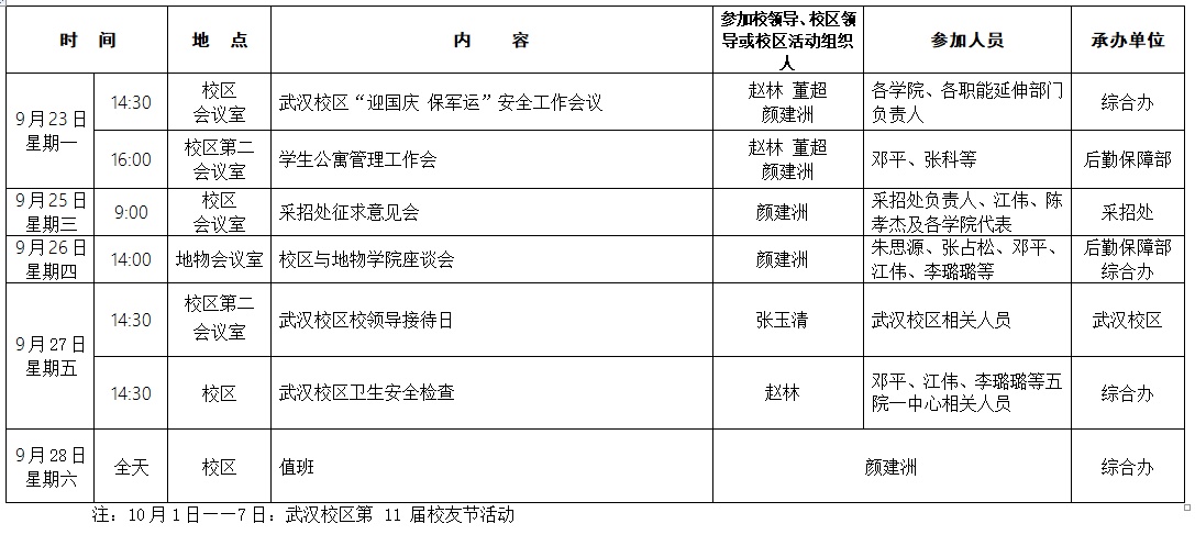 2019-2020学年第一学期第6周校区主要工作及活动安排表