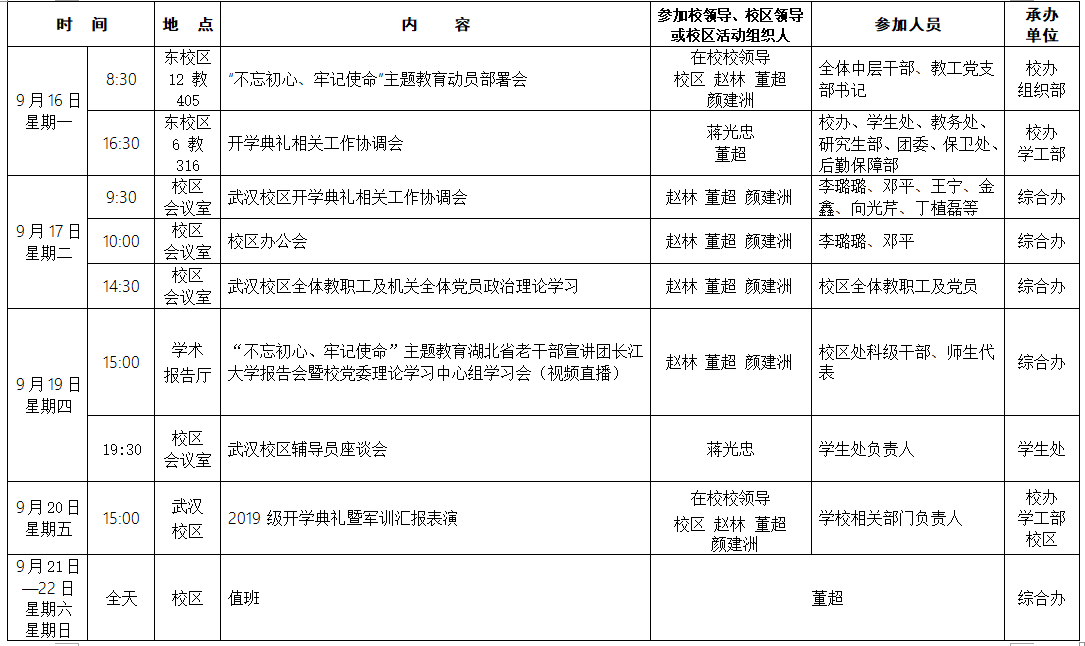 2019-2020学年第一学期第3周校区主要工作及活动安排表