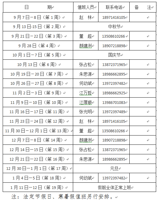 为保证学校在周末双休日期间信息畅通,及时、妥善处置突发事件,确保校区安全稳定,从 2017年6月开始,校区实行周末双休日值班制度,值班人员由各单位主要负责人组成。现将2019-2020学年第二学期周末双休日值班安排如下: