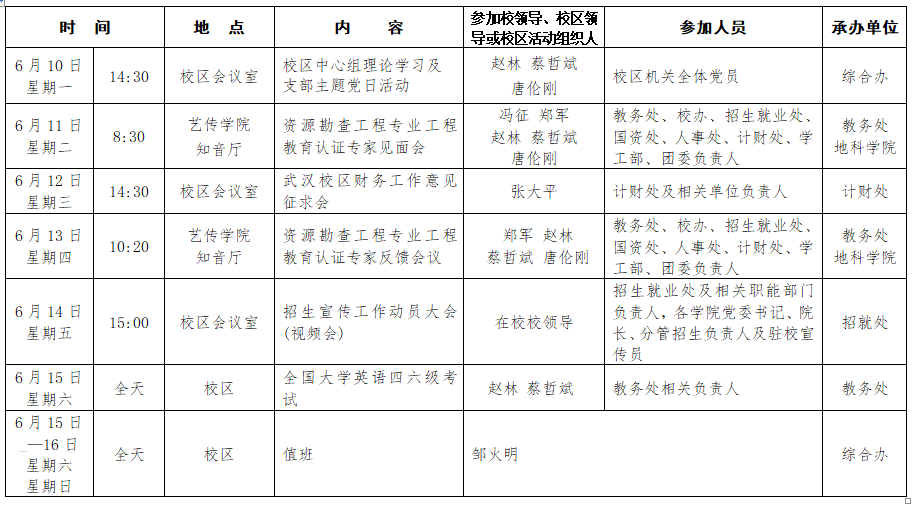 2018-2019学年第二学期第16周校区主要工作及活动安排表