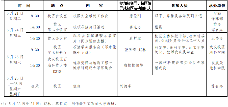 2018-2019学年第二学期第14周校区主要工作及活动安排表