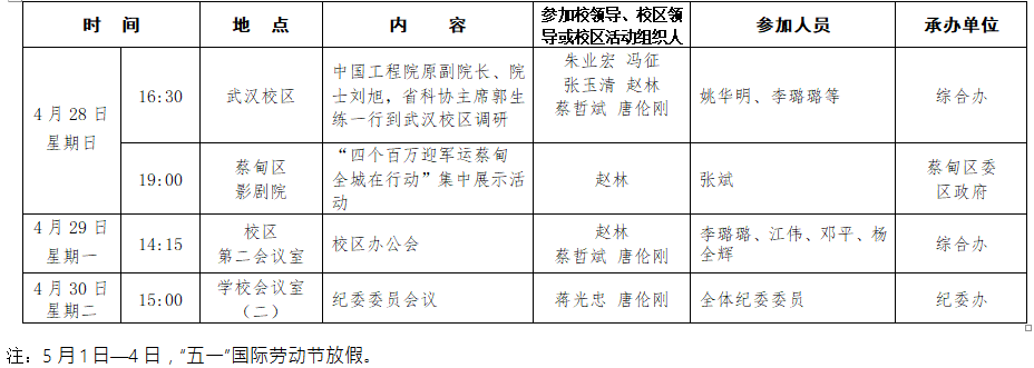 2018-2019学年第二学期第11周校区主要工作及活动安排表