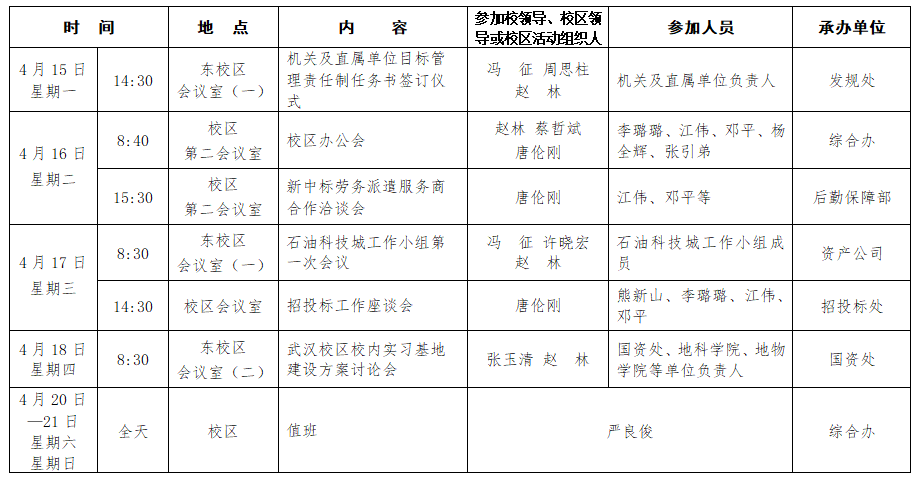 2018-2019学年第二学期第7周校区主要工作及活动安排表