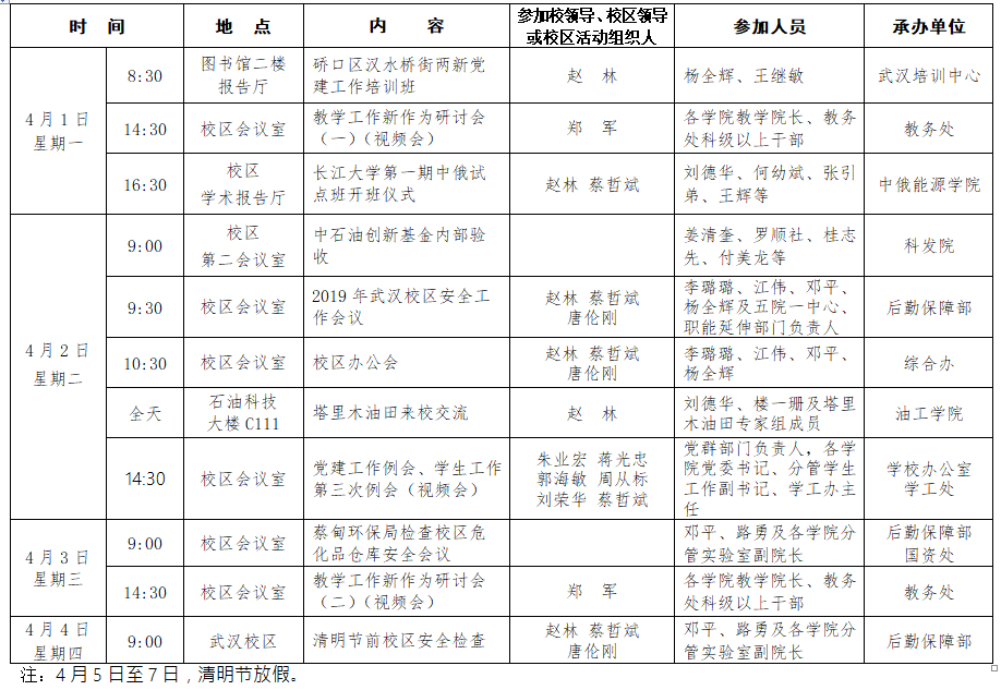 2018-2019学年第二学期第7周校区主要工作及活动安排表