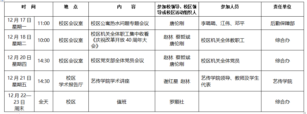 2018-2019学年第一学期第15周校区主要工作及活动安排表