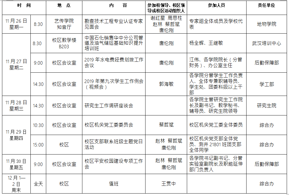 2018-2019学年第一学期第12周校区主要工作及活动安排表