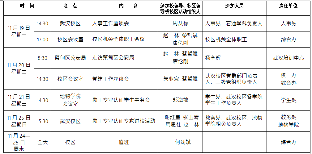 2018-2019学年第一学期第11周校区主要工作及活动安排表