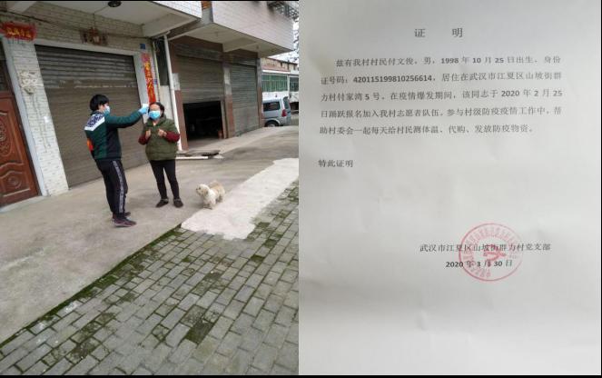 家在武汉的资工21603班付文俊得知疫情紧急人手吃紧后,就踊跃报名参加志愿者工作。村民被要求居家隔离后,江夏区山坡街道群力村空旷的街道上,每日只见他和同事奔忙的身影。帮助村民购买各种生活用品、测量体温,在村口防疫站值班……虽马不停蹄,却甘之如饴。他说:“前线的事情总需要人做,我的家乡和祖国现在‘生病’了,我愿意迎难而上,为疫情防控尽绵薄之力,不枉‘英雄的人民’这个称呼。”