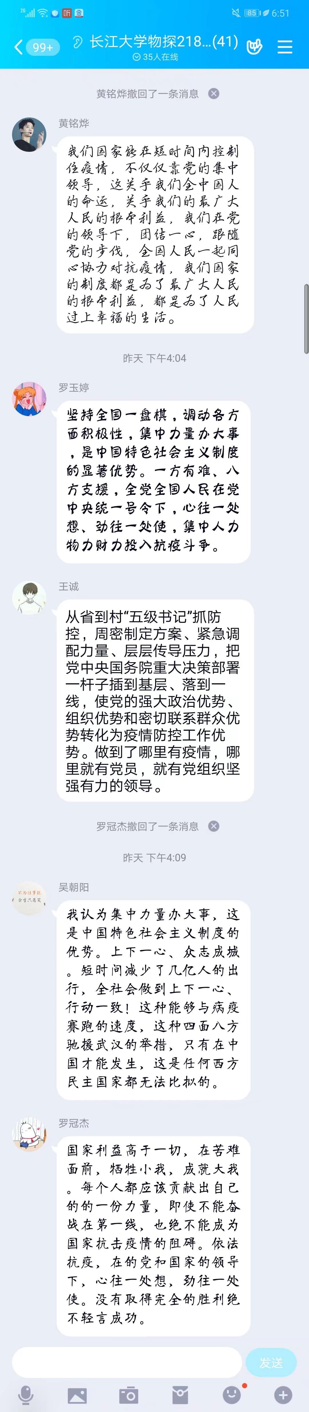 各班班会主持人带同学们了解了本次疫情防控的决策部署,解读了我国能够迅速控制疫情,创造了短时间建成数所医院奇迹的原因,以及中国的制度优势。观看完共一个半小时的网络直播课后,大家就“在抗击疫情斗争中深化理论认识”“疫情大考告诉我们什么?”“总结历史经验 增强必胜信心”“战疫里的最美青春——中国青年责任与担当”这四个主题展开了讨论。大家积极发言,他们表示新型冠状病毒肺炎虽然来势汹汹,但是作为大学生的我们,要把这次疫情当作是一种学习的机会,去学习前辈们这种处变不惊,舍己为人的精神。