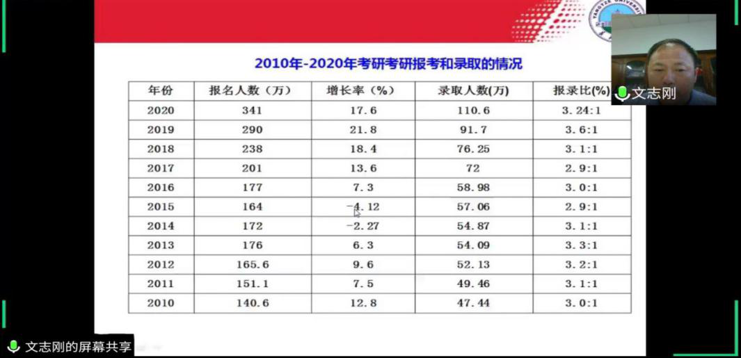 随后2016级郭海云同学分享了2020年考研经历,如何在备考过程中克服困难、坚定信心等,在线上给学弟学妹们加油鼓劲!2017级史心宇同学代表全体考研学子表示要向学长学姐们学习,早日锁定考研目标,争取再创佳绩!