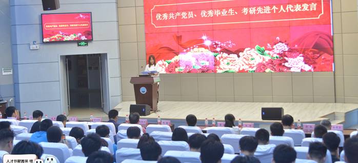“春天有进喜路樱花散落,夏天有知音湖水天一色,秋天有润泽路银杏叶飘落,冬天有五颜六色的伞在雨中走过”,优秀共产党员、优秀毕业生、考研先进个人代表彭亚倩同学激情发言,道出了全体毕业生的心声,并且鼓励2018级的同学们“不忘初心,砥砺前行”。