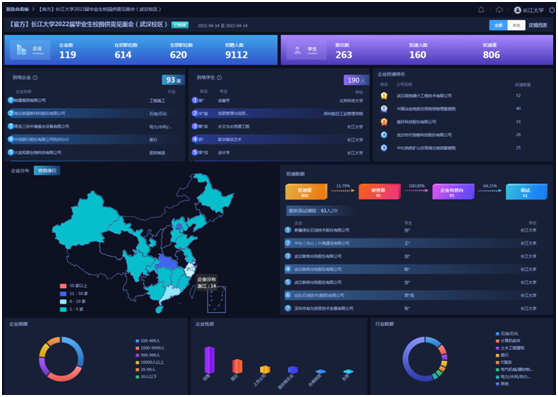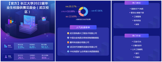 入驻此次双选会的企业包含国企、事业单位、上市公司、优质民企等共计119家企业,其中湖北省内单位共46家,占比38.7%;提供了包含能源、计算机、土木工程建筑等行业,包括石油、石化、石油地质、储备干部、工程管理以及软件开发等620个岗位,招聘需求量累计达9112人。根据数据显示,截止到双选会结束,学生投递简历806份,初步意向百余人。