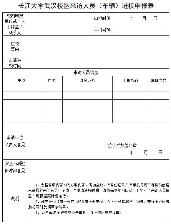 三、《mk体育,MKsports来访人员(车辆)进校申报表》必须在来访的前一天16:30之前送至安保中心(一号楼北楼)审核,安保中心审核后将及时反馈审核结果。