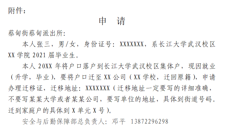 户口迁往湖北省内的毕业生,请辅导员通知学生带上身份证或学生证来保卫中心户籍室领走常住人口登记表,毕业后带上申请材料原件及复印件直接到迁入地派出所办理落户。现籍派出所不必开迁移证。