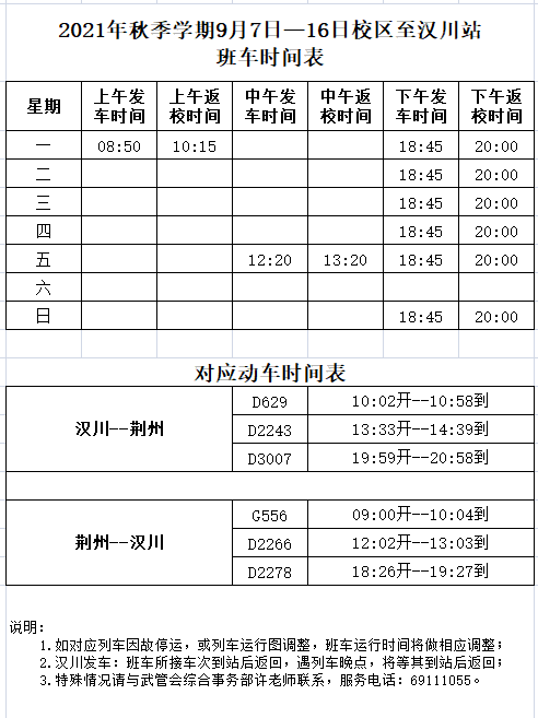 2021年秋季学期9月7日—16日校区至汉川站班车时间表
