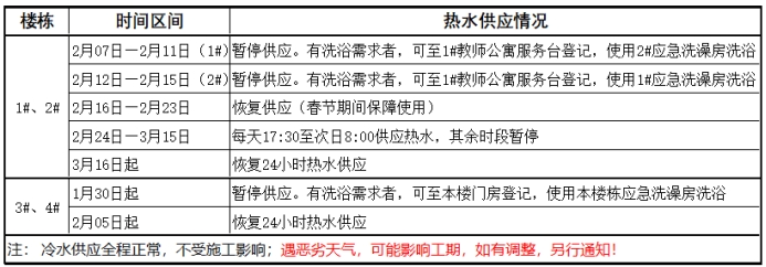 寒假期间,校内1-4号公寓热水系统进行整体更换施工,总工期为2026年1月26日—3月16日。施工人员将在宿管人员全程陪同下进入宿舍内部作业,以保障宿舍安全(单一宿舍入户时间约为2小时);因入户施工(含打孔、拆卸等工序)可能产生少量粉尘及水渍,为避免个人物品受到污染或损坏,请各位师生提前将卫生间内的个人物品收拾整理、妥善保管。