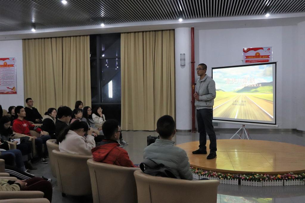 讲坛开始时,伴随着《遥望西藏》的音乐,李坤同学向大家展示了自己从成都出发,途经康定城、毛垭大草原、怒江七十二拐、布达拉宫等地直至终点的摄影图集。壮丽的美景和旅途的困顿在图集中得以淋漓尽致的展现。他语气轻快,略带幽默,讲述自己故事的同时也为听众揭开西藏的神秘面纱。在介绍完路线后李坤说到:“一路风景虽美,但一路骑行所感受到的温暖与感动才是我最大的收获。”