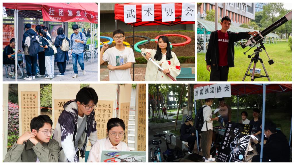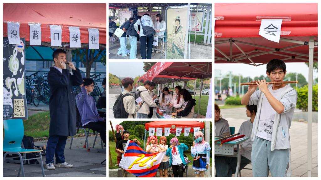 各个社团都在为吸引新人展现特色。你看,动漫社coser的舞蹈,引得一众好奇的同学驻足观看。你听,不远处笛箫协会笛声悠扬婉转,将同学们拉进一场梦境。你品,书画协会的作品,或是笔走龙蛇的书法大作,或是勾画点缀的国画,让同学们领略书香世界。不仅这些,跑步协会、黄金矿工说唱团、深蓝口琴社等多种多样丰富的社团都在展示“绝活”,展现青春的颜色。