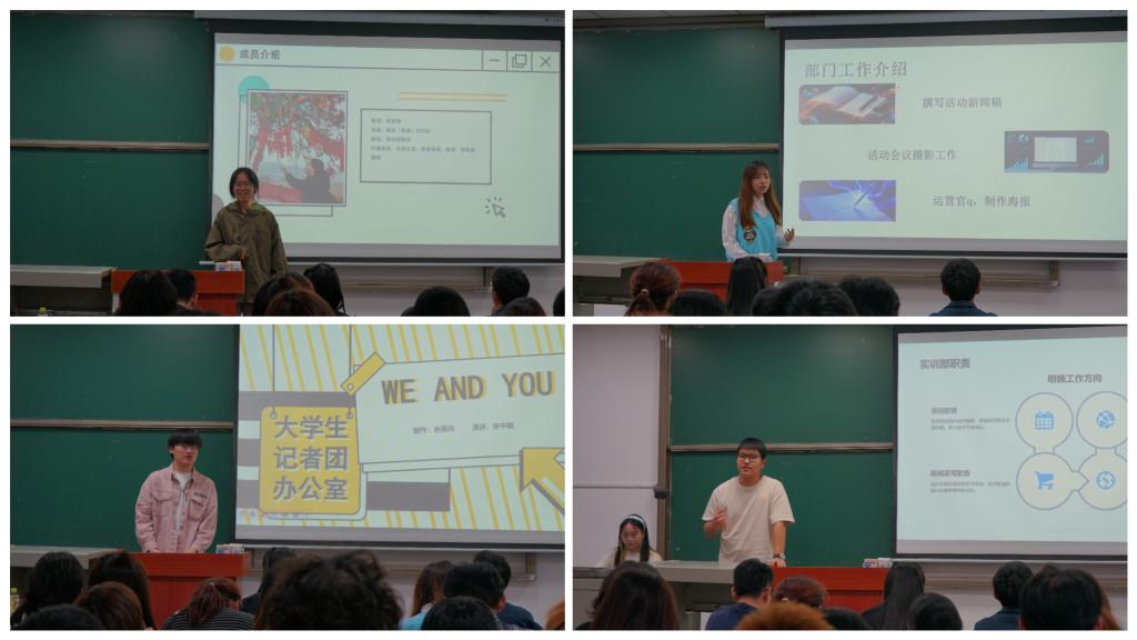 随后,记者团见面环节接棒展开。团长王浩宇首先回顾了上学年的工作成果。紧接着,主席团及宣传部、办公室、策划部、实训部等部门负责人通过PPT演讲,详细解读部门职责,同时介绍部员构成与未来工作展望,为新成员勾勒出清晰的成长蓝图。